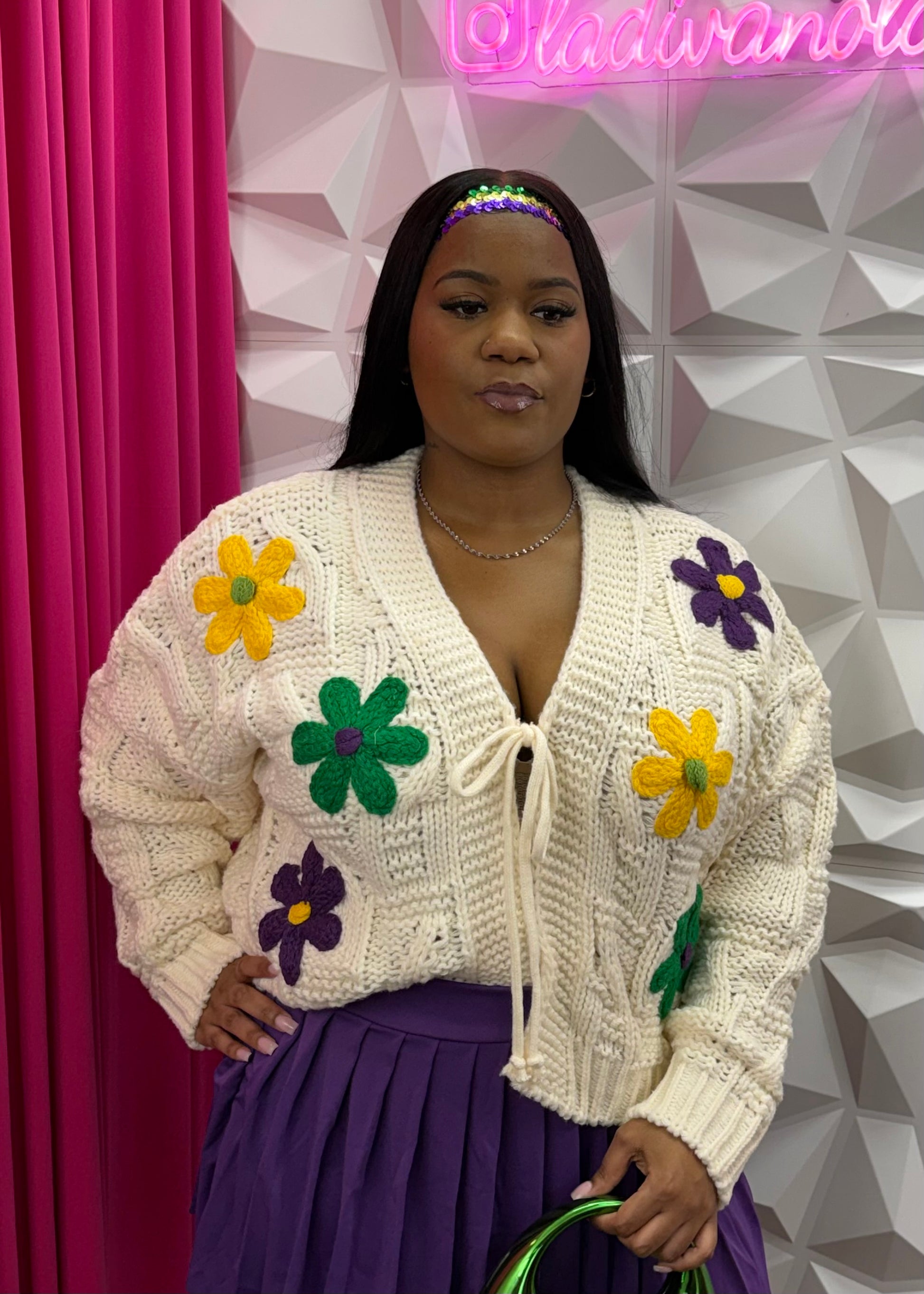 Mardi Gras Flower Patched Texture Sweater Cardigan