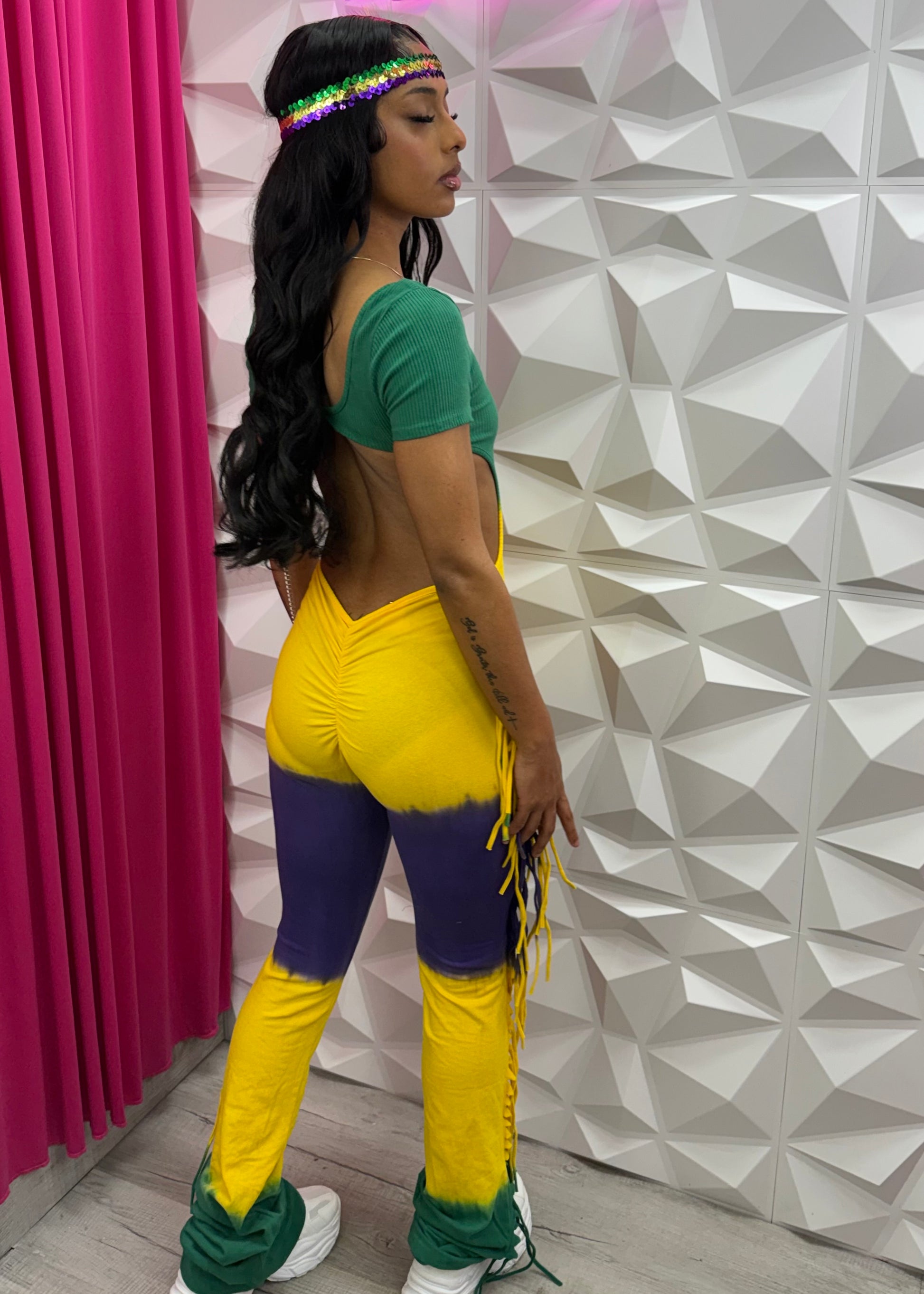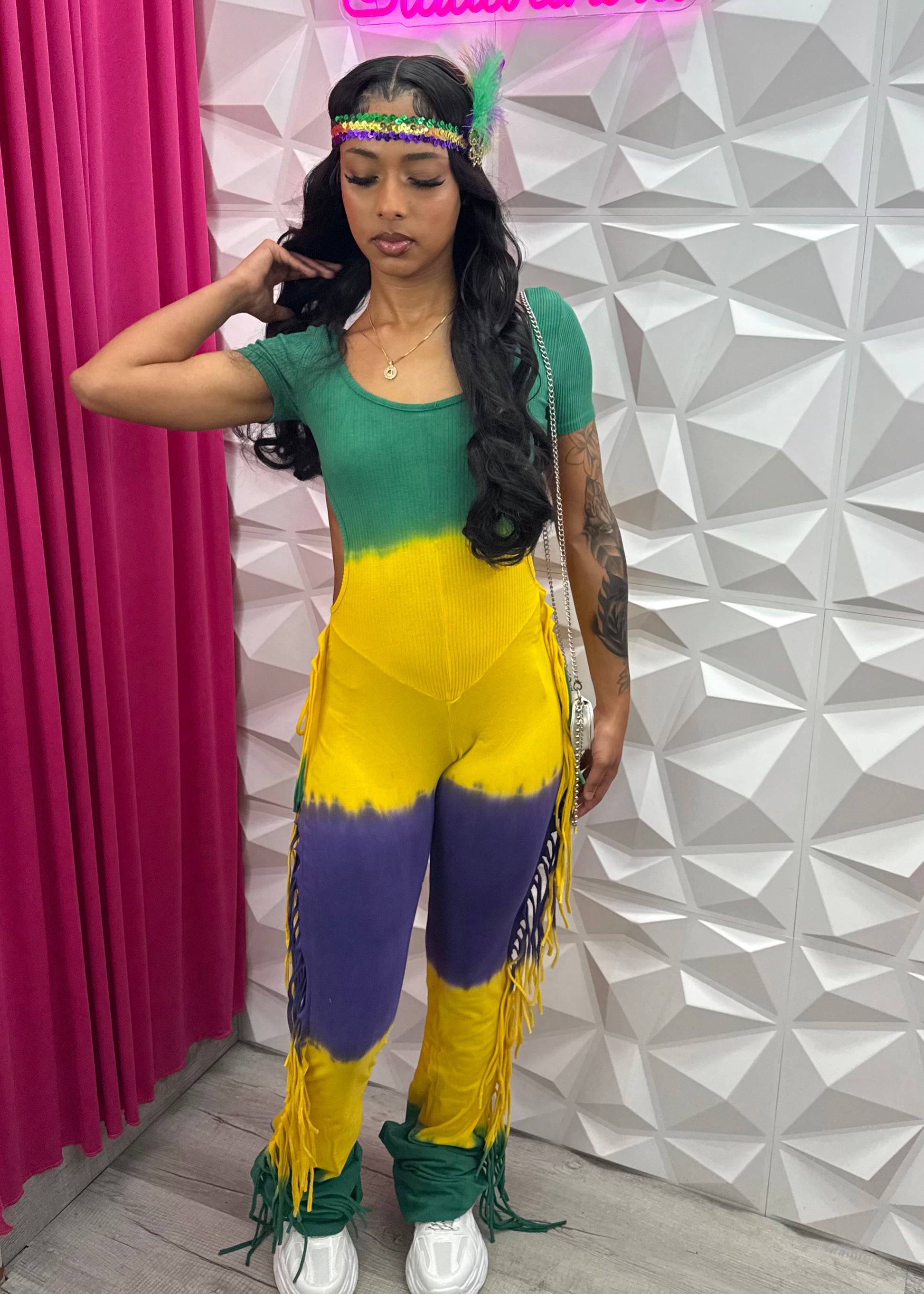 -MARDI GRAS TIE DYE -STRIPE -OPEN BACK -STRETCH -SIDE FRINGE -TALL GIRL FRIENDLY -FLARE LEG