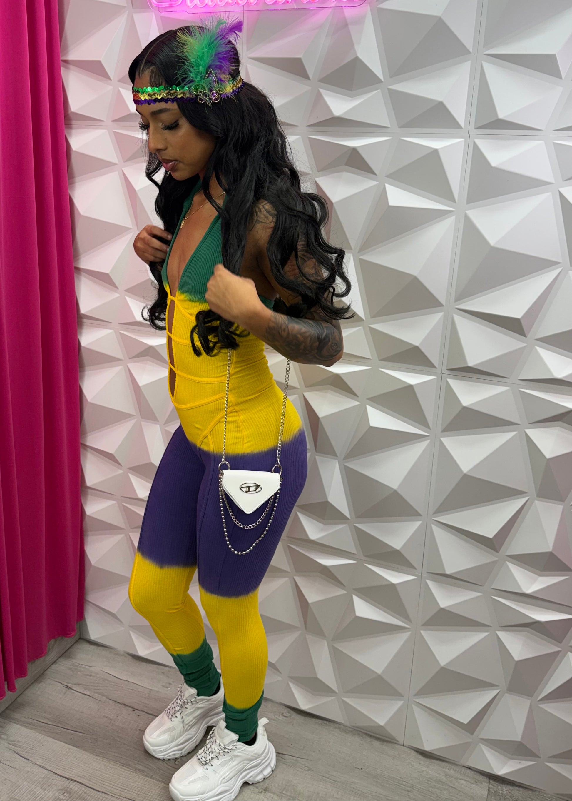 -MARDI GRAS TIE DYE -STRIPE -FRONT CUT-OUT -COLLARED -OPEN BACK -DEEP-V -STRETCH -TALL GIRL FRIENDLY