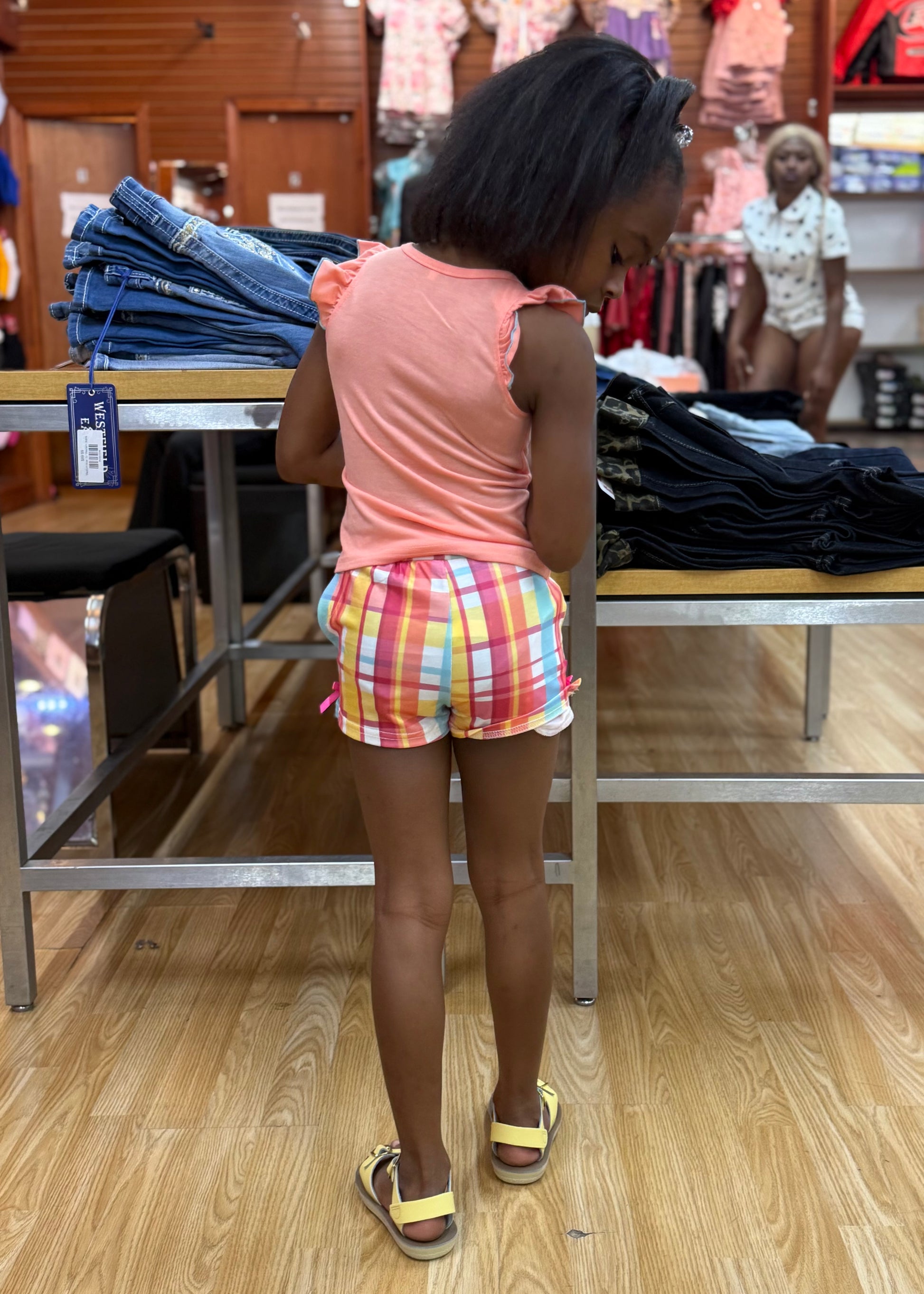 Bloomer with plaid printed with elastci wasit and pockets.