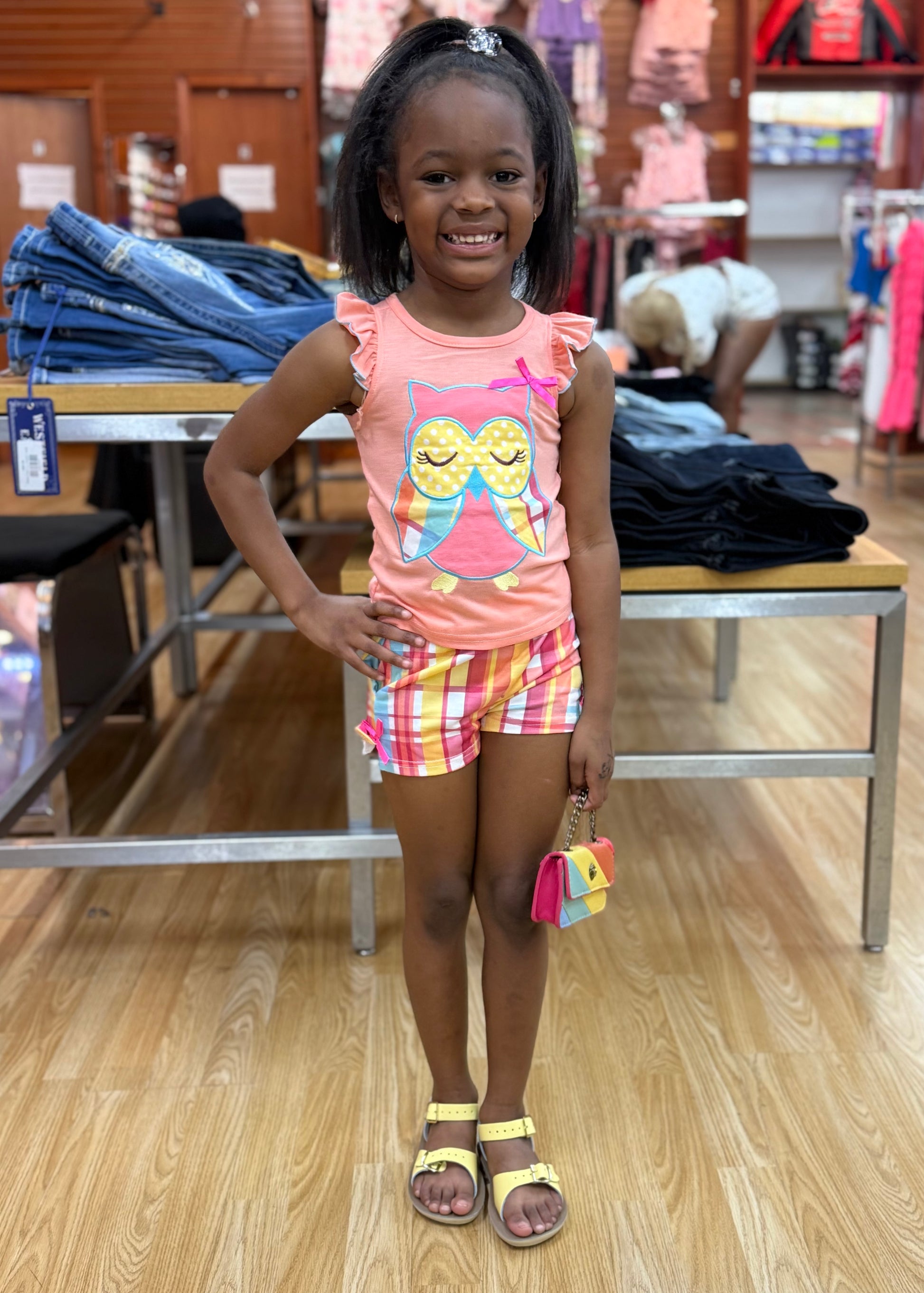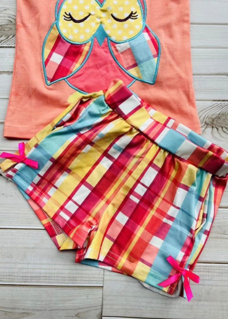 Top features with plaid owl embroidery with bow on the coral background with flutter ruffle sleeves.