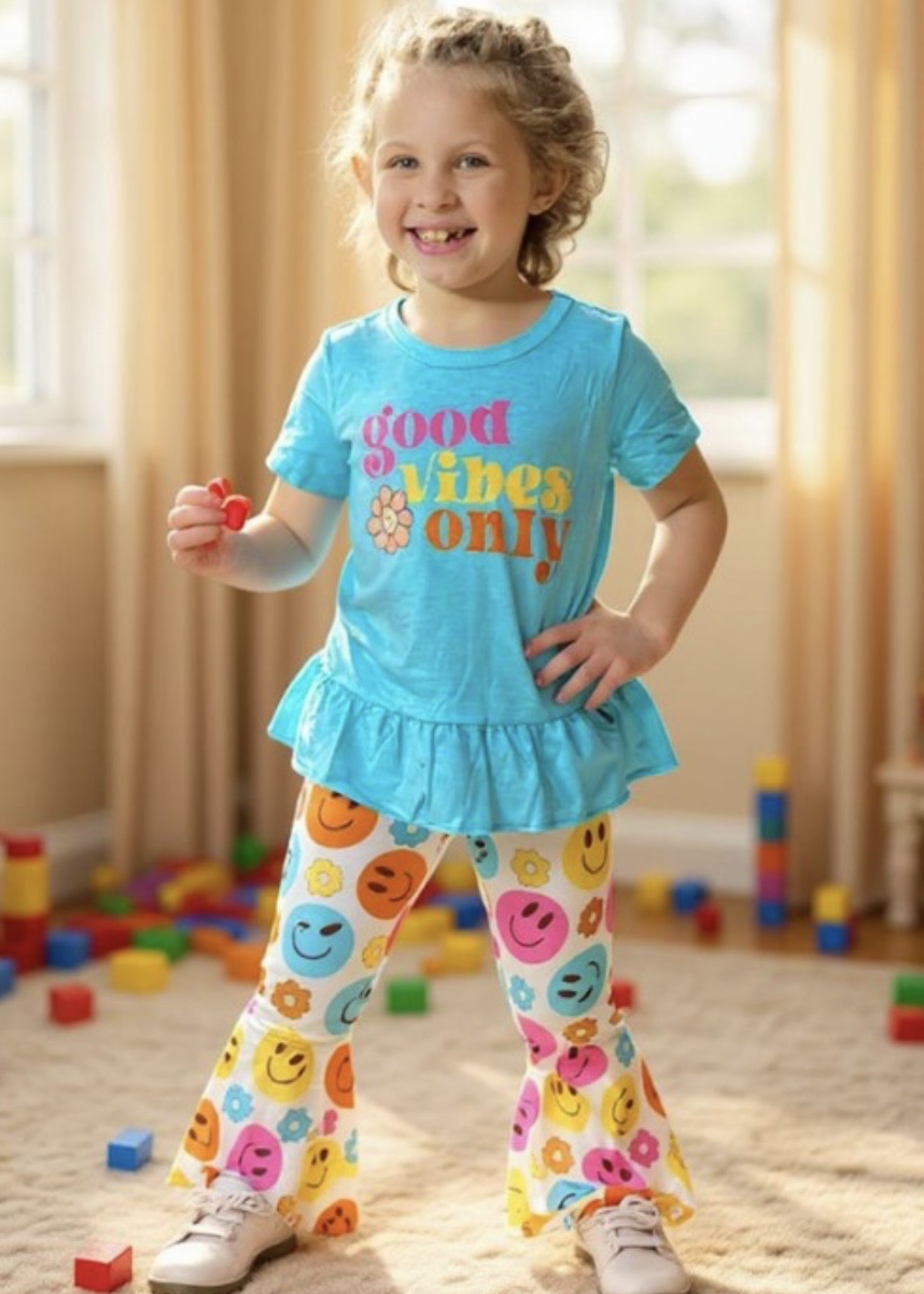 Top features wording "good vibes only" on mint backgorund with ruffle trim and short sleeves.